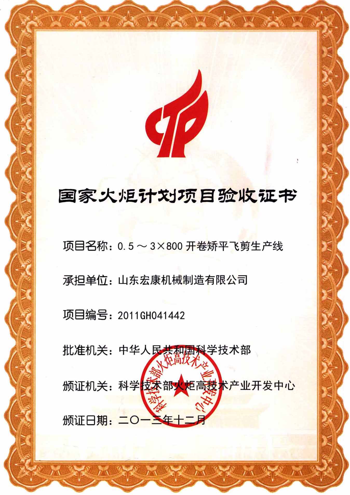 国家火炬计划项目验收证书