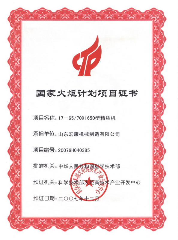 国家火炬计划项目证书